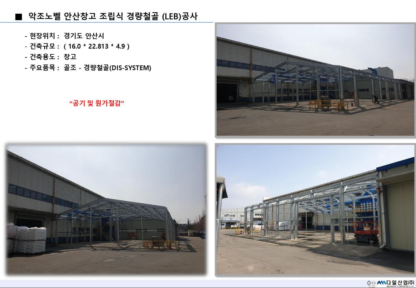 악조노벨 안산창고 조립식 경량철골 공사 페이지 정보 작성자 : 다일산업(주) 작성일 : 20-06-17 16:15 조회 : 2,602회 관련링크 본문 이전글 다음글 목록 개인정보처리방침 “다일산업(주)“(이하 “회사”)는 개인정보보호법에 따라 이용자의 개인정보 보호 및 권익을 보호하고 개인정보와 관련한 이용자의 고충을 원활하게 처리할 수 있도록 다음과 같은 처리방침을 두고 있습니다. 고객님의 정보는 개인의 소중한 자산인 동시에 회사 운영의 중요한 자료가 됩니다. 그러므로 회사는 운영상의 모든 과정에서 고객님의 개인정보를 보호하는데 최선의 노력을 다할 것을 약속 드립니다. 회사는 개인정보처리방침을 개정하는 경우 웹사이트를 통하여 공지할 것입니다. 제 1장. 개인정보 수집 동의절차 회사는 귀하께서 웹사이트의 개인정보보호방침 또는 이용약관의 내용에 대해 (동의한다)버튼 또는 (동의하지 않는다)버튼을 클릭할 수 있는 절차를 마련하여 (동의한다)버튼을 클릭하면 개인정보 수집에 대해 동의한 것으로 봅니다. 제 2장. 개인정보의 수집 및 이용 목적 회사는 개인정보를 다음의 목적을 위해 활용합니다. 처리한 개인정보는 다음의 목적 이외의 용도로는 사용되지 않으며 이용 목적이 변경될 시 사전동의를 구할 예정입니다. 가. 성명, 아이디, 비밀번호 : 회원 가입의사 확인, 서비스 부정이용 방지, 접속 빈도파악, 회원제 서비스 이용에 따른 본인 식별 절차 나. 이메일주소, 전화번호(수신여부 확인) : 고지사항 전달, 본인 의사 확인, 불만 처리 등 원활한 의사소통 경로의 확보, 이벤트 및 광고성 정보 제공 및 참여기회 제공, 접속 빈도파악 또는 회원의 서비스이용에 대한 통계 다. 주소, 전화번호 : 경품과 물품 배송에 대한 정확한 배송지의 확보 제 3장. 광고정보의 전송 가. 회사는 귀하의 명시적인 수신거부의사에 반하여 영리목적의 광고성 정보를 전송하지 않습니다. 나. 회사는 약관변경, 기타 서비스 이용에 관한 변경사항, 새로운 서비스/신상품이나 이벤트 정보, 기타 상품정보 등을 전자우편, 휴대폰 문자전송 기타 전지적 전송매체 등의 방법으로 알려드립니다. 이 경우 관련 법령상 명시사항 및 명시방법을 준수합니다. 다. 회사는 상품정보 안내 등 온라인 마케팅을 위해 광고성 정보를 전자우편 등으로 전송하는 경우 전자 우편의 제목란 및 본문란에 귀하가 쉽게 알아 볼 수 있도록 조치합니다. 제 4장. 개인정보의 수집범위 회사는 별도의 회원가입 절차 없이 대부분의 콘텐츠에 자유롭게 접근할 수 있습니다. 회원제 서비스를 이용하고자 할 경우 다음의 정보를 입력해주셔야 합니다. 가. 개인정보 수집항목 : 이름, 이메일, 생년월일, 아이디, 비밀번호, 성별, 주소, 휴대폰 번호(전화), 이메일 수신여부, SMS 수신여부, 서비스 이용기록, 접속로그, 받는 고객 정보(이름, 전화번호, 주소, 이메일) 나. 개인정보 수집방법 : 홈페이지 내 회원가입 및 게시판 등 제 5장. 개인정보의 보유 및 이용기간 회사는 개인정보 수집 및 이용목적이 달성된 후에는 해당 정보를 지체 없이 파기합니다. 단, 다음의 정보에 대해서는 아래의 이유로 명시한 기간 동안 보존합니다. -보존항목 : 이름, 로그인 ID, 비밀번호, 이메일, 생년월일 -보존근거 : 불량 회원의 부정한 이용의 재발 방지 -보존기간 : 1개월 그리고 관계법령의 규정에 의하여 보존할 필요가 있는 경우 회사는 아래와 같이 관계법령에서 정한 일정한 기간 동안 회원정보를 보관합니다. 소비자의 불만 또는 분쟁처리에 관한 기록 : 3년 (전자상거래 등에서의 소비자보호에 관한 법률) 제 6장. 개인정보의 파기 절차 및 방법 회사는 원칙적으로 개인정보 처리목적이 달성된 경우에는 지체 없이 해당 개인정보를 파기합니다. 파기의 절차, 기한 및 방법은 다음과 같습니다. -파기절차 회원님이 회원가입 등을 위해 입력하신 정보는 목적 달성 후 별도의 DB로 옮겨져(종이의 경우 별도의 서류함) 내부 방침 및 기타 관련 법령에 의한 정보보호 사유에 따라(보유 및 이용기간 참조) 일정 기간 저장 된 후 파기합니다. 별도 DB로 옮겨진 개인정보는 법률에 의한 경우가 아니고서는 보유 이외의 다른 목적으로 이용되지 않습니다. -파기기한 이용자의 개인정보는 개인정보의 보유기간이 경과된 경우에는 보유기간의 종료일로부터 5일 이내에, 개인정보의 처리 목적 달성, 해당 서비스의 폐지, 사업의 종료 등 그 개인정보가 불필요하게 되었을 때에는 개인정보의 처리가 불필요한 것으로 인정되는 날로부터 5일 이내에 그 개인정보를 파기합니다. -파기방법 전자적 파일 형태의 정보는 기록을 재생할 수 없는 기술적 방법을 사용합니다. 제 7장. 개인정보의 안전성 확보 조치 회사는 개인정보보호법 제29조에 따라 다음과 같이 안전성 확보에 필요한 조치를 하고 있습니다. 가. 개인정보 취급 직원의 최소화 및 교육 개인정보를 취급하는 직원을 지정하고 담당자에 한정시켜 최소화 하여 개인정보를 관리하는 대책을 시행하고 있습니다. 나. 개인정보의 암호화 이용자의 개인정보는 비밀번호는 암호화 되어 저장 및 관리되고 있어, 본인만이 알 수 있으며 중요한 데이터는 파