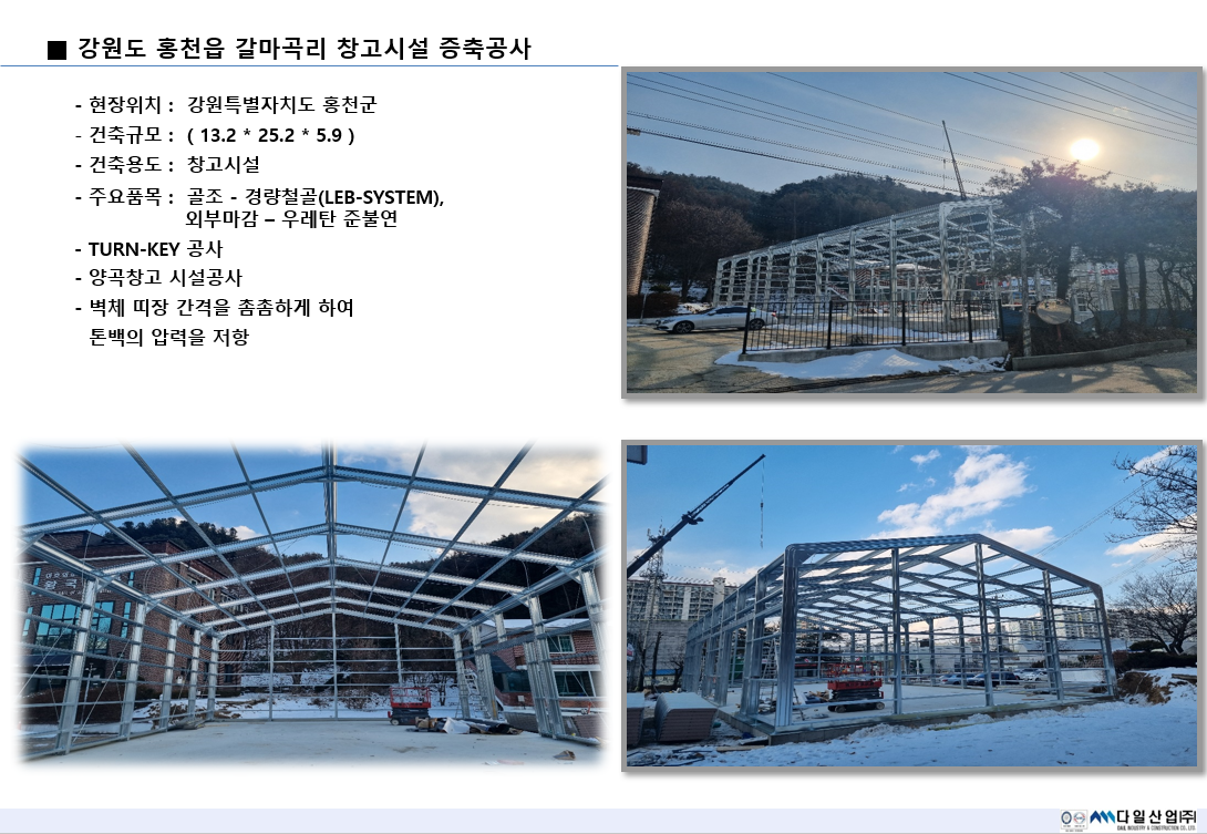 강원도 홍천읍 갈마곡리 창고시설 신축공사 페이지 정보 작성자 : 다일산업(주) 작성일 : 26-02-05 16:21 조회 : 34회 관련링크 본문 이전글 다음글 목록 개인정보처리방침 “다일산업(주)“(이하 “회사”)는 개인정보보호법에 따라 이용자의 개인정보 보호 및 권익을 보호하고 개인정보와 관련한 이용자의 고충을 원활하게 처리할 수 있도록 다음과 같은 처리방침을 두고 있습니다. 고객님의 정보는 개인의 소중한 자산인 동시에 회사 운영의 중요한 자료가 됩니다. 그러므로 회사는 운영상의 모든 과정에서 고객님의 개인정보를 보호하는데 최선의 노력을 다할 것을 약속 드립니다. 회사는 개인정보처리방침을 개정하는 경우 웹사이트를 통하여 공지할 것입니다. 제 1장. 개인정보 수집 동의절차 회사는 귀하께서 웹사이트의 개인정보보호방침 또는 이용약관의 내용에 대해 (동의한다)버튼 또는 (동의하지 않는다)버튼을 클릭할 수 있는 절차를 마련하여 (동의한다)버튼을 클릭하면 개인정보 수집에 대해 동의한 것으로 봅니다. 제 2장. 개인정보의 수집 및 이용 목적 회사는 개인정보를 다음의 목적을 위해 활용합니다. 처리한 개인정보는 다음의 목적 이외의 용도로는 사용되지 않으며 이용 목적이 변경될 시 사전동의를 구할 예정입니다. 가. 성명, 아이디, 비밀번호 : 회원 가입의사 확인, 서비스 부정이용 방지, 접속 빈도파악, 회원제 서비스 이용에 따른 본인 식별 절차 나. 이메일주소, 전화번호(수신여부 확인) : 고지사항 전달, 본인 의사 확인, 불만 처리 등 원활한 의사소통 경로의 확보, 이벤트 및 광고성 정보 제공 및 참여기회 제공, 접속 빈도파악 또는 회원의 서비스이용에 대한 통계 다. 주소, 전화번호 : 경품과 물품 배송에 대한 정확한 배송지의 확보 제 3장. 광고정보의 전송 가. 회사는 귀하의 명시적인 수신거부의사에 반하여 영리목적의 광고성 정보를 전송하지 않습니다. 나. 회사는 약관변경, 기타 서비스 이용에 관한 변경사항, 새로운 서비스/신상품이나 이벤트 정보, 기타 상품정보 등을 전자우편, 휴대폰 문자전송 기타 전지적 전송매체 등의 방법으로 알려드립니다. 이 경우 관련 법령상 명시사항 및 명시방법을 준수합니다. 다. 회사는 상품정보 안내 등 온라인 마케팅을 위해 광고성 정보를 전자우편 등으로 전송하는 경우 전자 우편의 제목란 및 본문란에 귀하가 쉽게 알아 볼 수 있도록 조치합니다. 제 4장. 개인정보의 수집범위 회사는 별도의 회원가입 절차 없이 대부분의 콘텐츠에 자유롭게 접근할 수 있습니다. 회원제 서비스를 이용하고자 할 경우 다음의 정보를 입력해주셔야 합니다. 가. 개인정보 수집항목 : 이름, 이메일, 생년월일, 아이디, 비밀번호, 성별, 주소, 휴대폰 번호(전화), 이메일 수신여부, SMS 수신여부, 서비스 이용기록, 접속로그, 받는 고객 정보(이름, 전화번호, 주소, 이메일) 나. 개인정보 수집방법 : 홈페이지 내 회원가입 및 게시판 등 제 5장. 개인정보의 보유 및 이용기간 회사는 개인정보 수집 및 이용목적이 달성된 후에는 해당 정보를 지체 없이 파기합니다. 단, 다음의 정보에 대해서는 아래의 이유로 명시한 기간 동안 보존합니다. -보존항목 : 이름, 로그인 ID, 비밀번호, 이메일, 생년월일 -보존근거 : 불량 회원의 부정한 이용의 재발 방지 -보존기간 : 1개월 그리고 관계법령의 규정에 의하여 보존할 필요가 있는 경우 회사는 아래와 같이 관계법령에서 정한 일정한 기간 동안 회원정보를 보관합니다. 소비자의 불만 또는 분쟁처리에 관한 기록 : 3년 (전자상거래 등에서의 소비자보호에 관한 법률) 제 6장. 개인정보의 파기 절차 및 방법 회사는 원칙적으로 개인정보 처리목적이 달성된 경우에는 지체 없이 해당 개인정보를 파기합니다. 파기의 절차, 기한 및 방법은 다음과 같습니다. -파기절차 회원님이 회원가입 등을 위해 입력하신 정보는 목적 달성 후 별도의 DB로 옮겨져(종이의 경우 별도의 서류함) 내부 방침 및 기타 관련 법령에 의한 정보보호 사유에 따라(보유 및 이용기간 참조) 일정 기간 저장 된 후 파기합니다. 별도 DB로 옮겨진 개인정보는 법률에 의한 경우가 아니고서는 보유 이외의 다른 목적으로 이용되지 않습니다. -파기기한 이용자의 개인정보는 개인정보의 보유기간이 경과된 경우에는 보유기간의 종료일로부터 5일 이내에, 개인정보의 처리 목적 달성, 해당 서비스의 폐지, 사업의 종료 등 그 개인정보가 불필요하게 되었을 때에는 개인정보의 처리가 불필요한 것으로 인정되는 날로부터 5일 이내에 그 개인정보를 파기합니다. -파기방법 전자적 파일 형태의 정보는 기록을 재생할 수 없는 기술적 방법을 사용합니다. 제 7장. 개인정보의 안전성 확보 조치 회사는 개인정보보호법 제29조에 따라 다음과 같이 안전성 확보에 필요한 조치를 하고 있습니다. 가. 개인정보 취급 직원의 최소화 및 교육 개인정보를 취급하는 직원을 지정하고 담당자에 한정시켜 최소화 하여 개인정보를 관리하는 대책을 시행하고 있습니다. 나. 개인정보의 암호화 이용자의 개인정보는 비밀번호는 암호화 되어 저장 및 관리되고 있어, 본인만이 알 수 있으며 중요한 데이터는 파